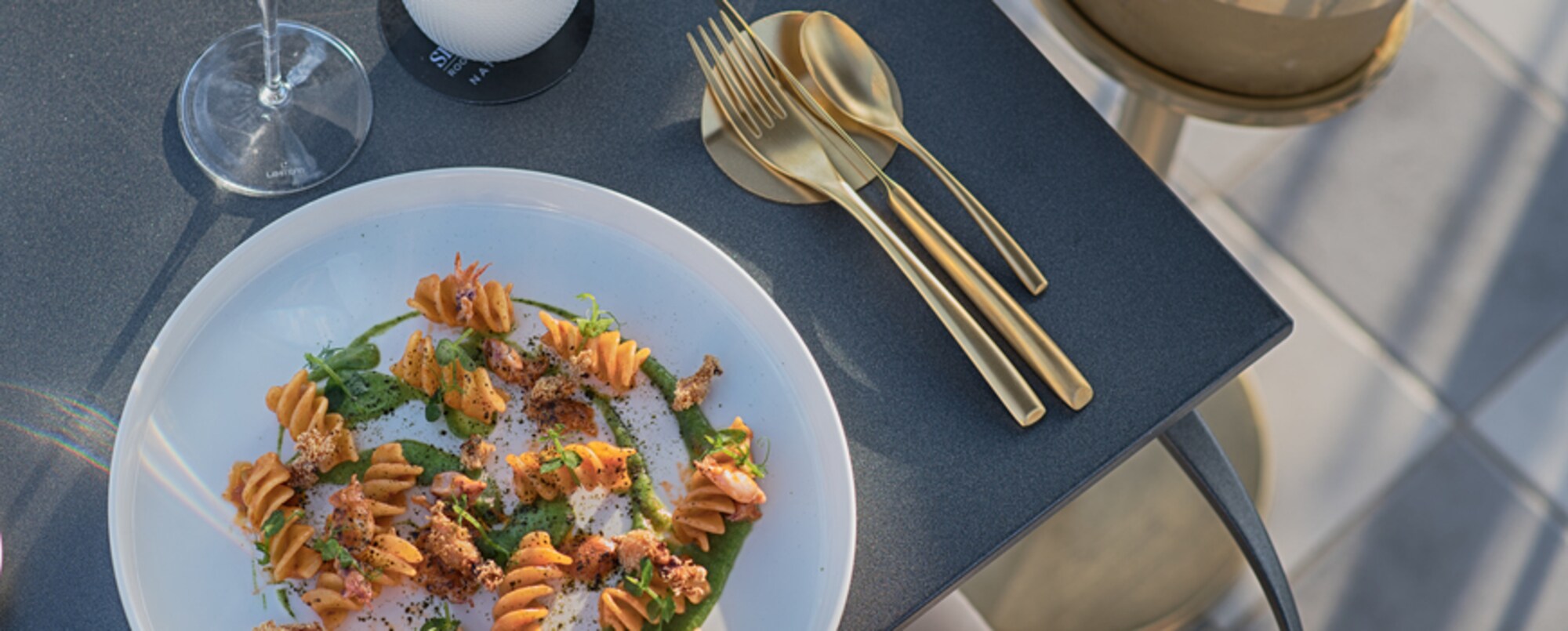 El chef Natale Giunta ofrece una cocina clásica italiana dentro de Oro Bistrot, un restaurante elegante y refinado, caracterizado por lujosos detalles de oro y verde agua, y un ambiente relajante. Una vista secreta de la ciudad caracteriza esta elegante terraza: Secret View | Rooftop Cocktail Bar, es un lugar único donde puedes disfrutar de un excelente cóctel hechizado por la belleza de la Ciudad Eterna. Todo concienzudamente diseñado con la pasión del chef Natale Giunta.