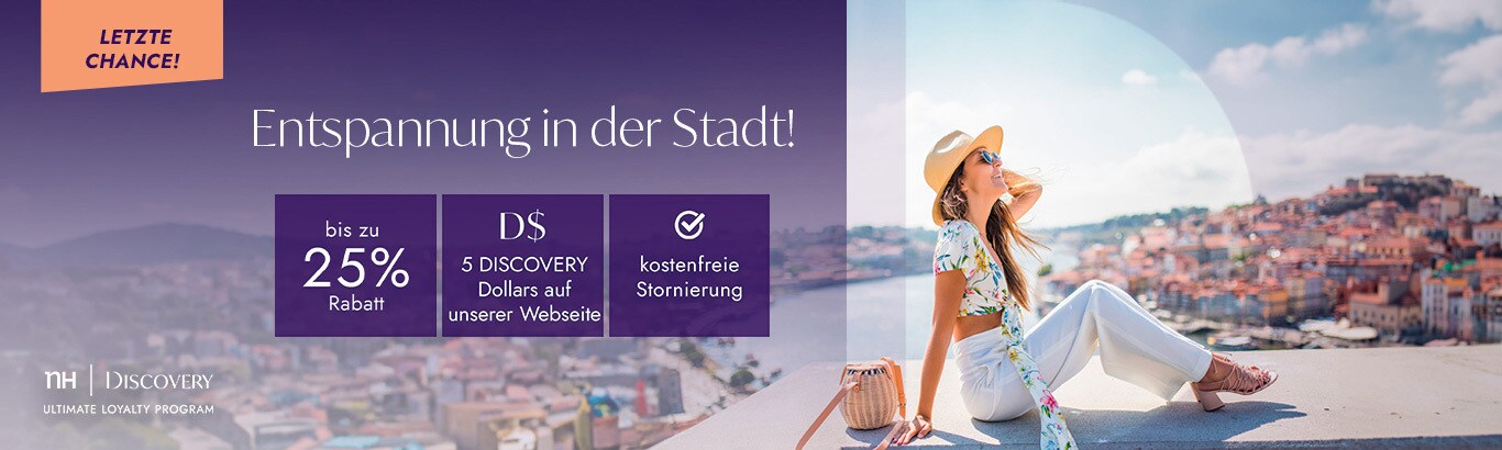 Das Angebot gilt auch für Mitglieder von NH DISCOVERY, die bis zu 10% Rabatt zusätzlich auf die Angebotsrate erhalten. In diesem Fall muss die Reservierung über unsere Webseite oder unsere Buchungshotline erfolgen. Um den exklusiven NH DISCOVERY-Rabatt zu erhalten, geben Sie bei der Buchung bitte Ihre Mitgliedsdaten an oder melden Sie sich während des Buchungsprozesses über den DISCOVERY-Tab an und bestätigen Ihre Anmeldung zum Programm.
