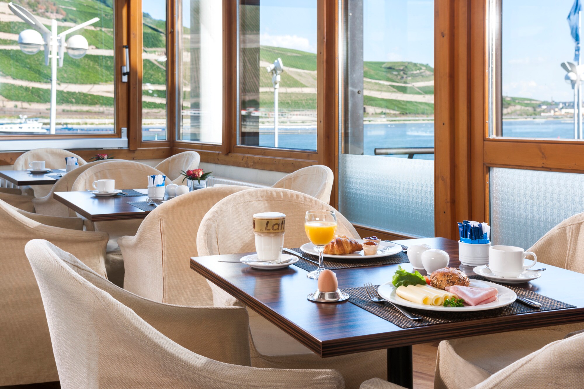 Visit our stylish and delicious Aquarius Restaurant, an open and inviting, light-filled space with fabulous Rhine River views. Stop in for the fresh breakfast buffet, or for an savory lunch or dinner from an international menu featuring local and seasonal specials. Clean, simple décor, set against the large windows with stunning river views, creates a welcoming atmosphere. In warm weather, you can enjoy refreshing drinks and meals on our charming terrace directly overlooking the Rhine.