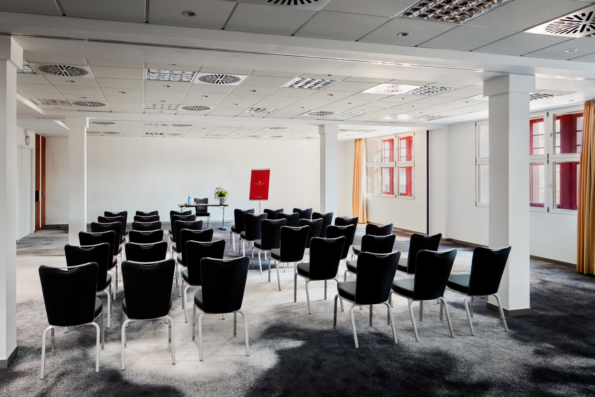 The hotel lobby and conference area can be adapted for many purposes. With its 600 m² surface area and 11 meter high ceiling, the lobby has seen a wide range of set-ups, such as a human table soccer, a climbing wall, proms and concerts. One of our staff members will assist you personally and professionally to help you with preparation and throughout your event. All of our meeting rooms have high-speed Internet connections (3 MBit line needs to be reserved), wireless Internet access, meeting kits with office supplies such as paper, pens and tape. The hotel's conference department provides projectors, screens, video equipment, lightning and sound equipment. We will also be pleased to set up a stage or dance floor for your event.