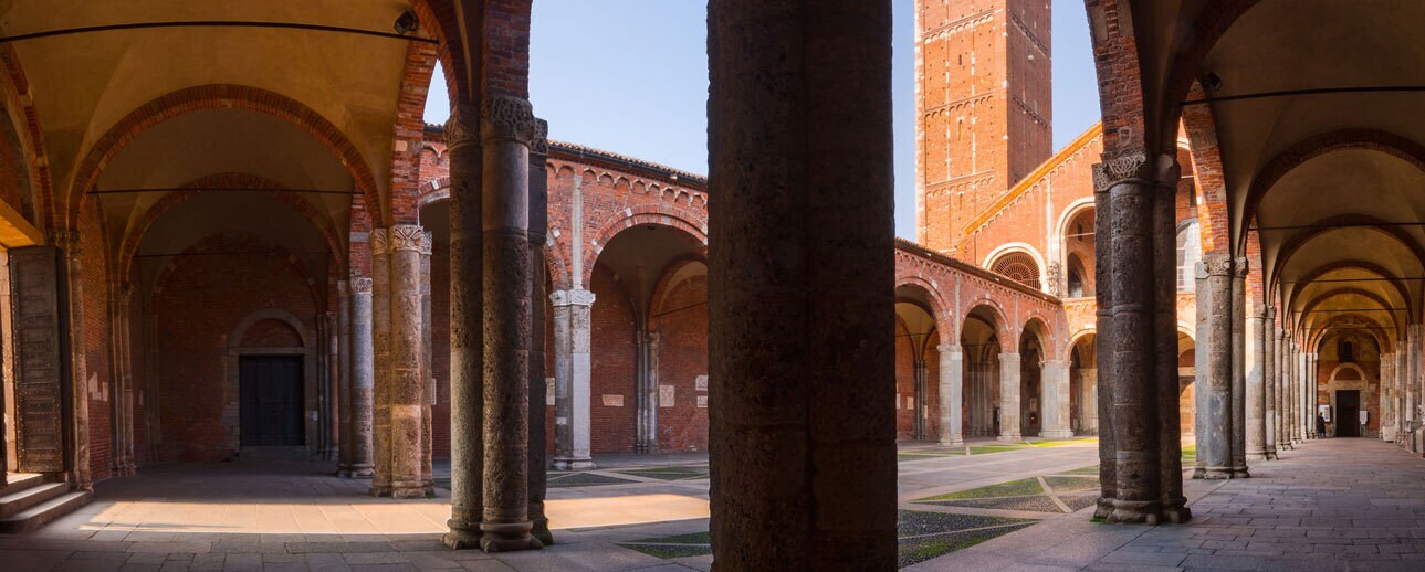La Basilica presenta una facciata a capanna con due logge sovrapposte, sormontata da due campanili: quello di destra, detto dei monaci, è più basso e di antica costruzione mentre quello di sinistra, noto come campanile dei canonici, risale al XII secolo ed è decorato con una serie di archetti pensili. Una volta superato il cancello d'ingresso, vi troverete nel cortile antistante la basilica, circondato su quattro lati da un magnifico quadriportico. Qui, originariamente, si riunivano i fedeli in attesa del Battesimo; successivamente il cortile divenne luogo di riunione e assemblea. Dalle finestre del loggione superiore il vescovo si affacciava a benedire la folla.