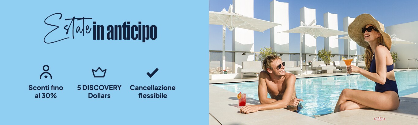 Lo sconto è applicabile solo sul pernottamento. Nel caso di piani con pernottamento e prima colazione, mezza pensione o piani all-inclusive, lo sconto sarà applicato solo sul prezzo della camera. Lo sconto può variare in base all’hotel e alle date. L’offerta è soggetta a disponibilità e potrebbe non essere disponibile in caso di elevato volume di prenotazioni. Possono applicarsi date di blackout e altri tipi di restrizioni. L’offerta non è cumulabile con altre promozioni.