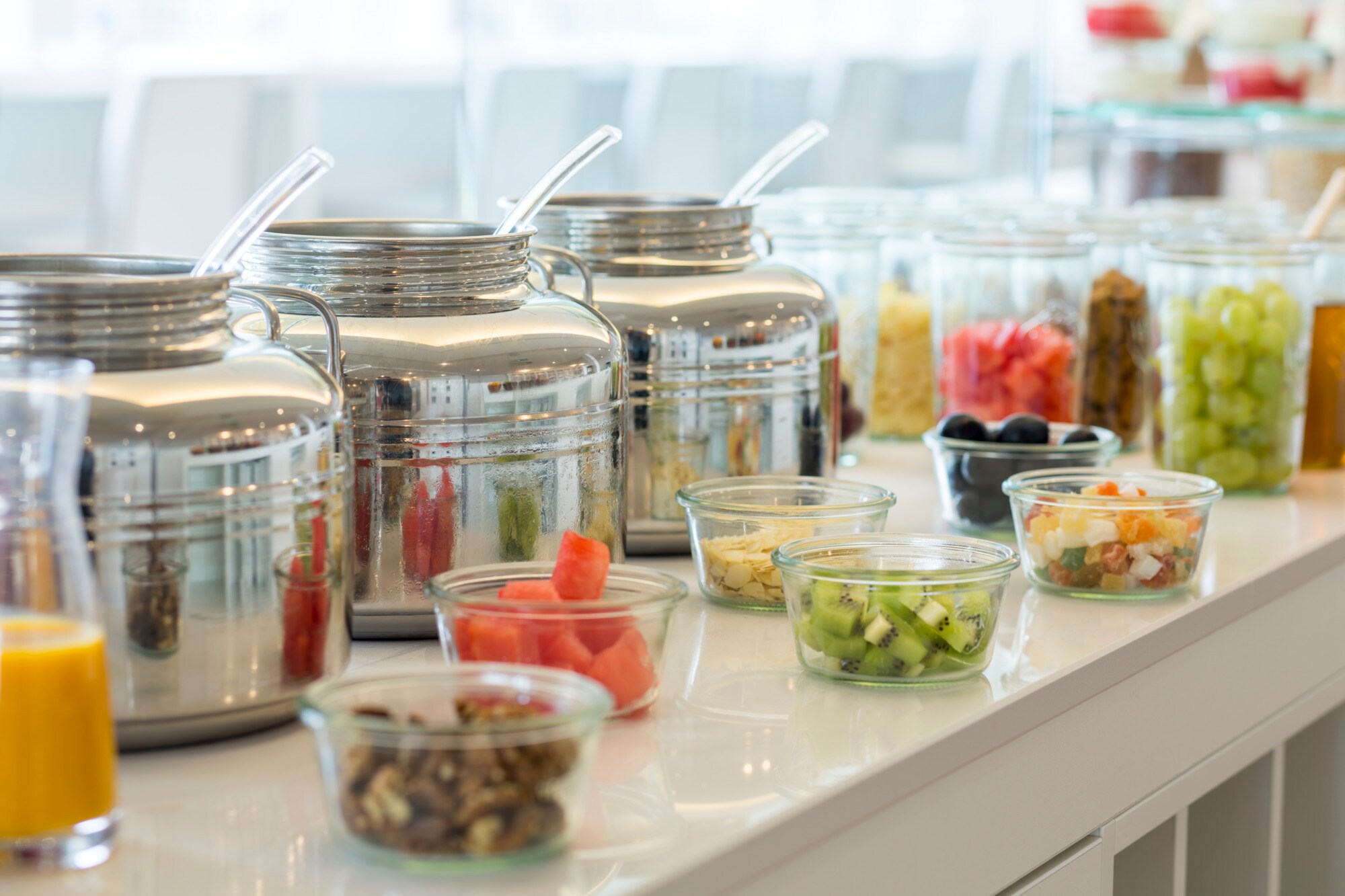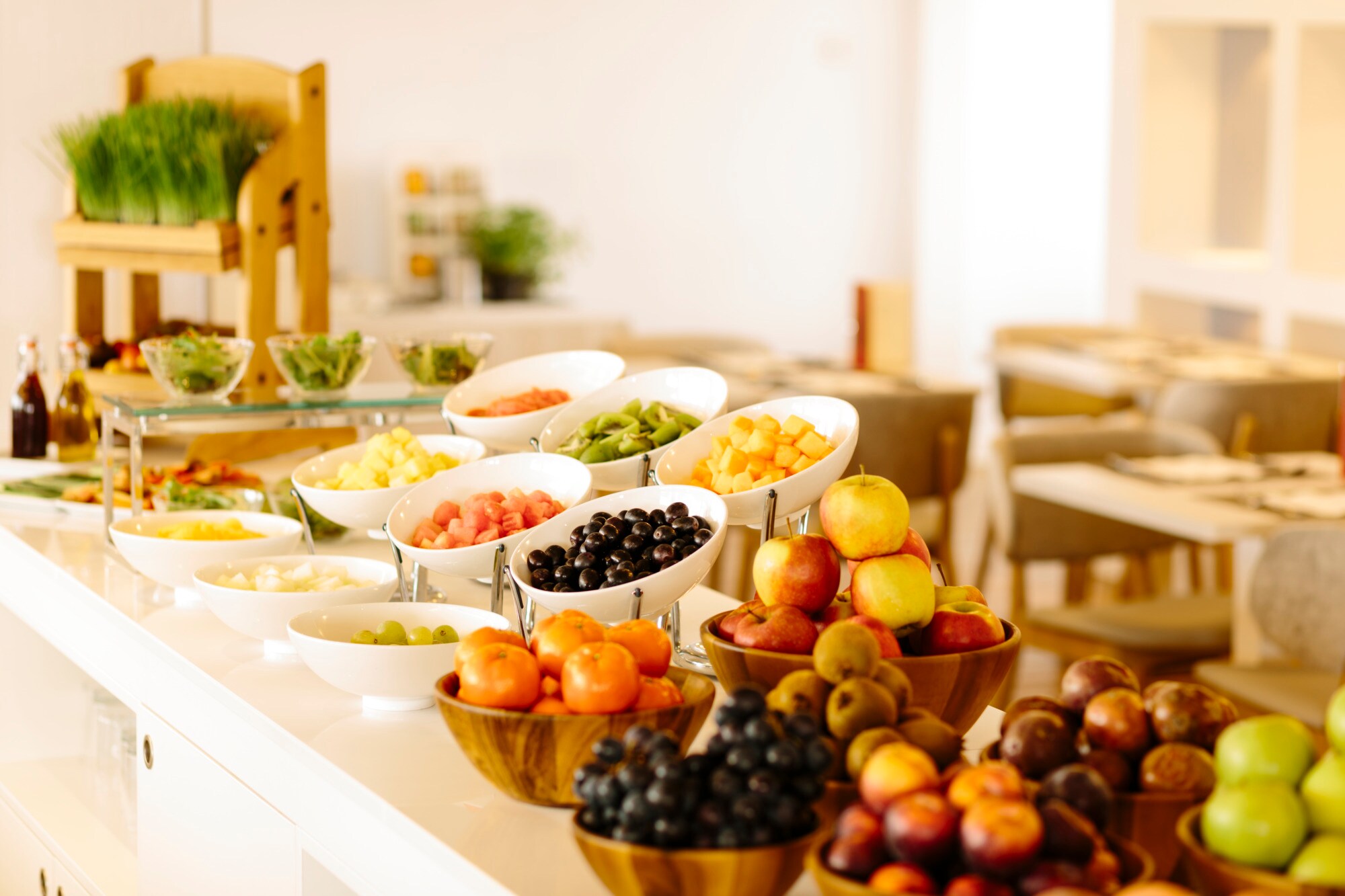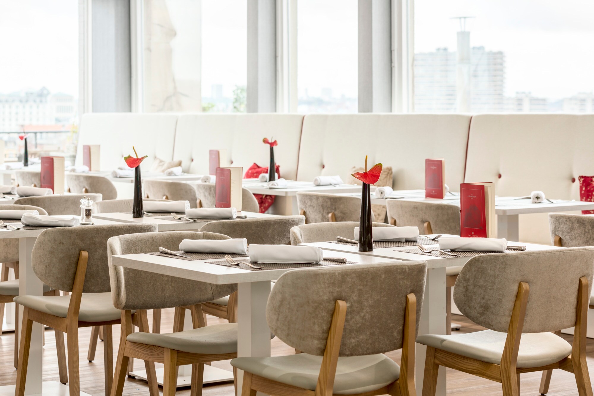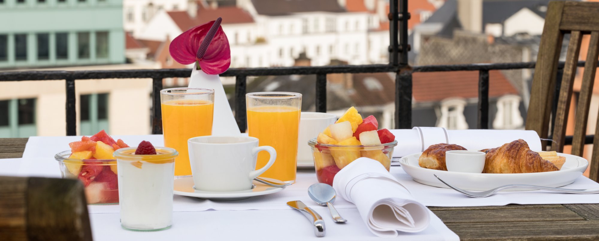 Servimos un abundante desayuno buffet en el último piso, donde puedes contemplar magníficas vistas de los edificios de la ciudad. También puedes disfrutar de una comida en la terraza.