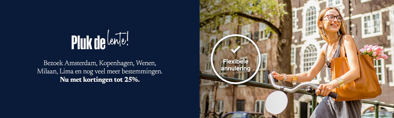 Reis naar Amsterdam, Milaan of naar tientallen andere bestemmingen met onze exclusieve aanbieding. Hoe eerder u boekt, hoe meer u bespaart. Boek nu uw voorjaarsuitje!